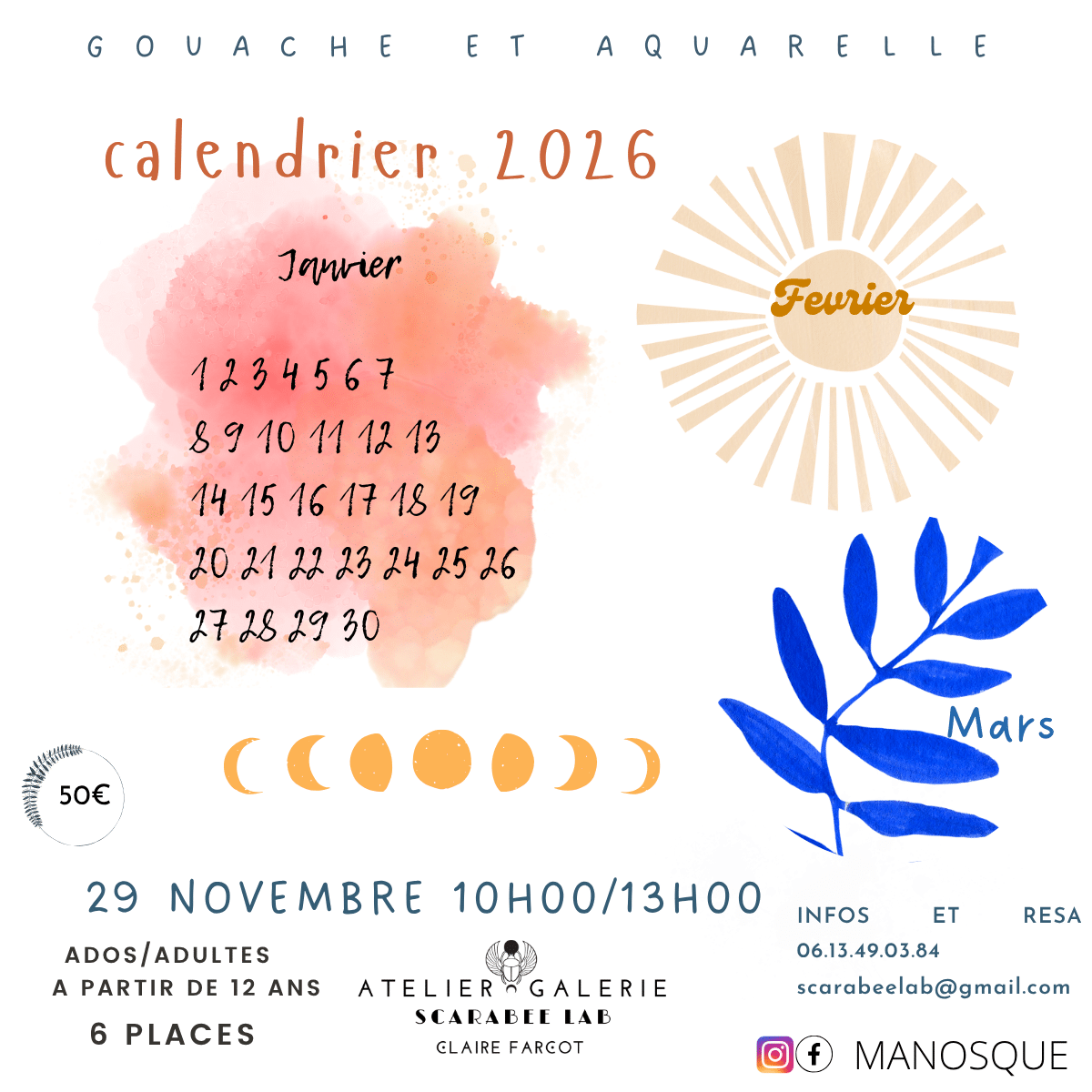 Créer son propre calendrier, qui portera en lui les graines que vous souhaitez planter pour 2026 : aquarelle/gouache/collage.Stage accessible à tous.