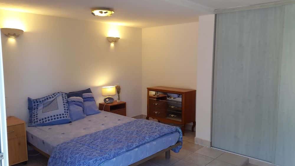 Exposition sud avec un salon/cuisine équipée, baie vitrée avec accès piscine (5x10m), pour 2 adultes, salle d'eau, wc séparés.