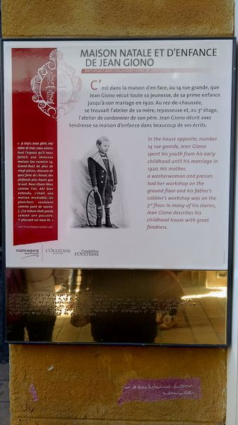 Une plaque indique que l'écrivain Jean Giono est né dans cette maison en mars 1895. Il vécut toute son enfance et sa jeunesse dans la maison en face du numéro 14 de la rue Grande.